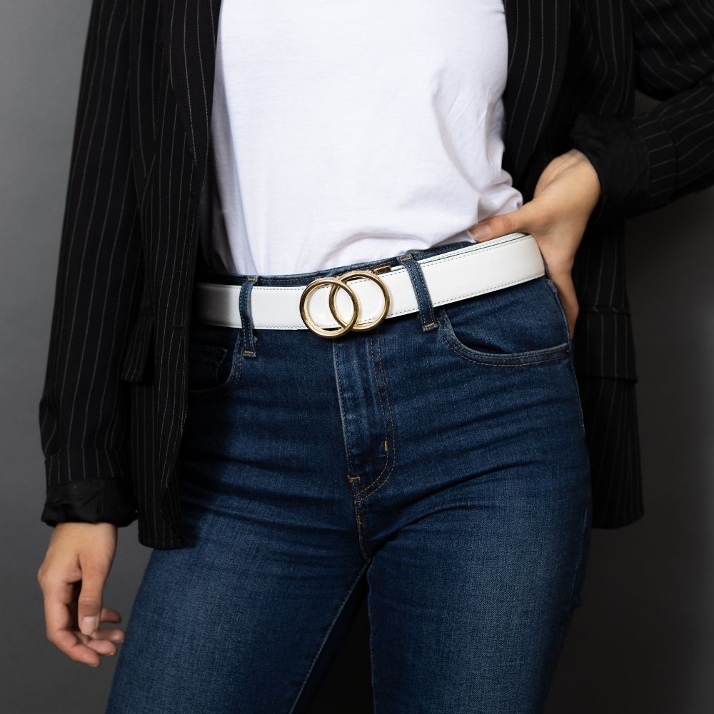 mit der Gold Loop Schnalle kombiniert strahlend weißes, veganes Material mit einer luxuriösen, goldenen Doppelschließe. Die Verbindung aus moderner Leichtigkeit und edlem Glanz verleiht jedem Look eine außergewöhnliche, elegante Note